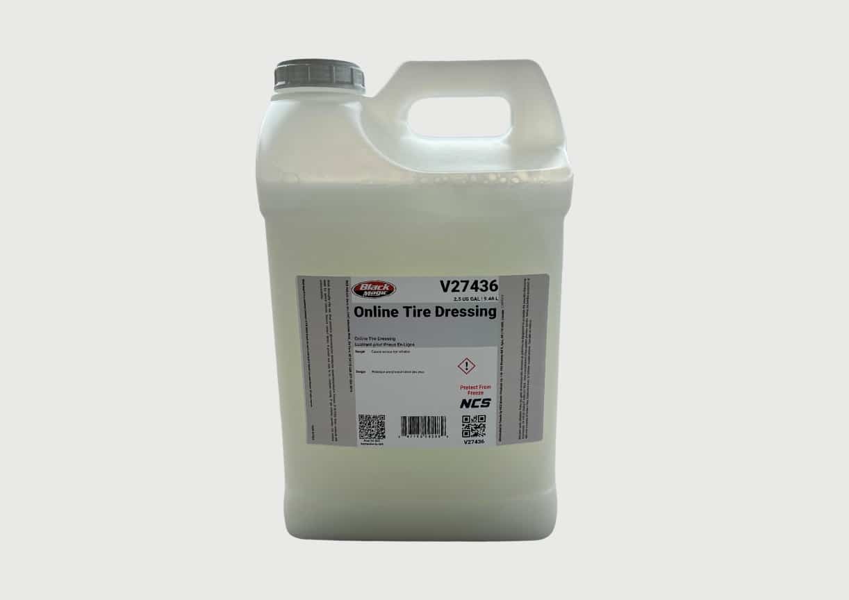 Black Magic Online Tire Dressing is a water-based silicone tire dressing designed to be applied through an online tire dressing applicator that physically contacts the tire to apply the product.